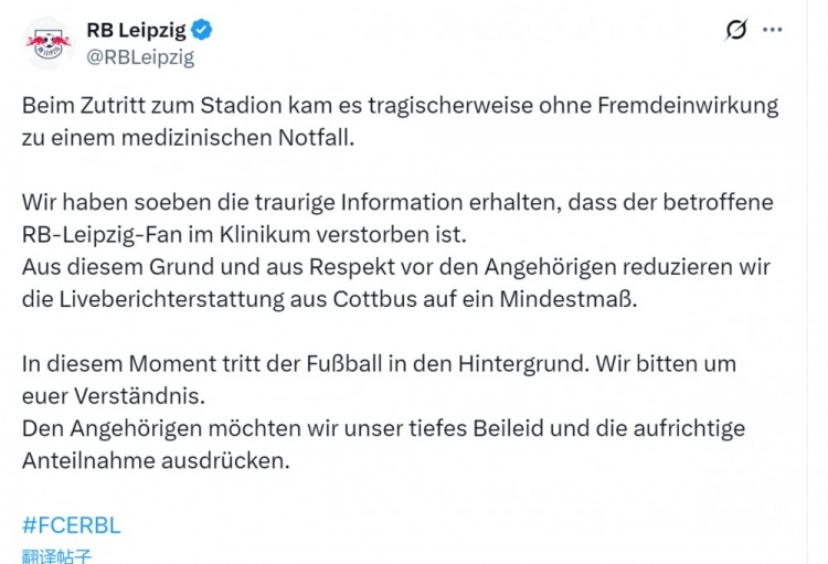 莱比锡俱乐部确认,一名莱比锡球迷进入运动活动 场 时发生紧急医疗情况(与外部因素无关),足球现场直播视频在线观看被送往医院,最终在医院去世,莱比锡俱乐部社媒因此将这场赛事 的直播报道减少到最低限度,并向家属表示深切慰问。