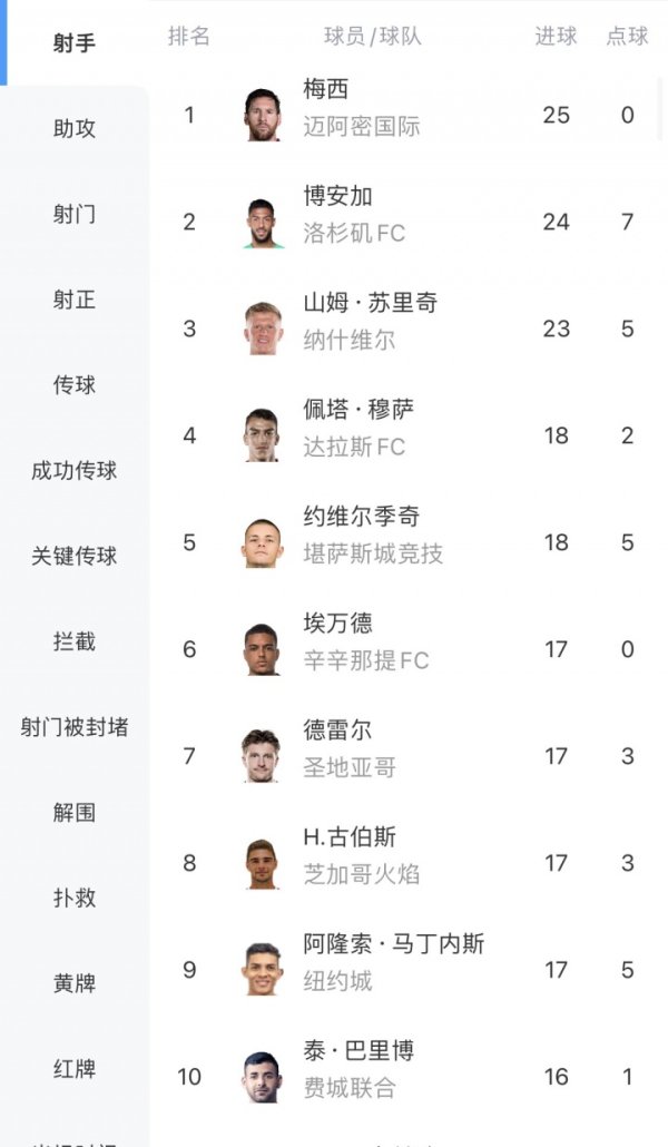 38岁冲金靴!梅西位列MLS射手榜第一,25球0点 2025-11-08 -