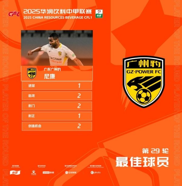 一射两传!官方:广东广州豹中场球员尼康当选中甲第29轮最佳球员11月6日讯 官方消息,广东广州豹中场球员尼康当选中甲第29轮最佳球员。 中甲第29轮,广东广州豹客场应战 4-2战胜青岛红狮。上半场第1分钟,尼康小角度凌空抽射建功首开记录。第23分钟,尼康在危险区域 内送出横传助功 队友破门。第57分钟,尼康斜传助功 队友再下一城。最终,尼康完成一射两传,帮助广东广州豹4-2战胜对手。 在第