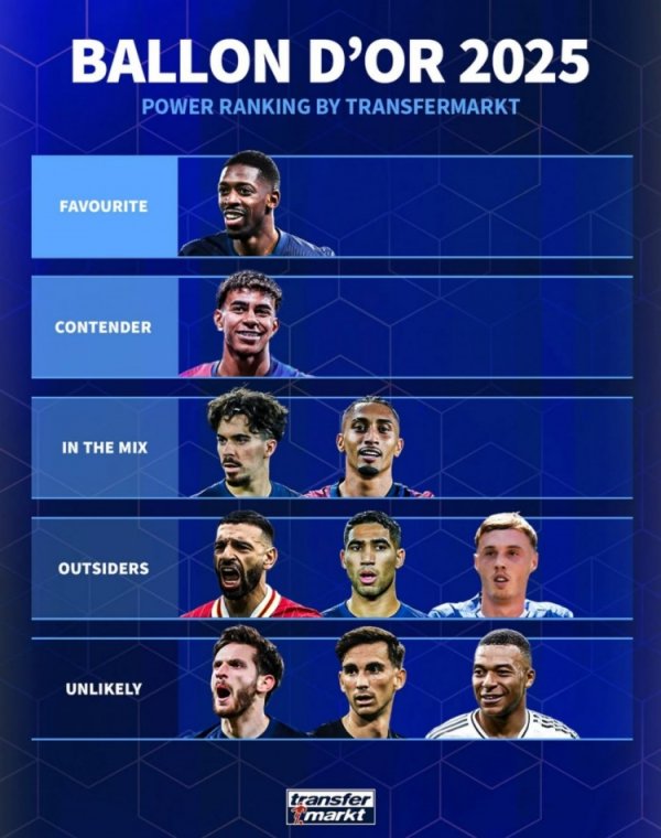 德转为金球奖角逐 评级:登贝莱最被看好,亚马尔为最大角逐 对手9月21日讯 金球奖颁奖典礼开幕在即,德转也对本次金球奖角逐 进行了评级,具体如下: 最被看好:登贝莱 角逐 者:亚马尔 处在讨论中:维蒂尼亚、拉菲尼亚 角逐 边缘:萨拉赫、阿什拉夫、帕尔默 不太可能:克瓦拉茨赫利亚、法比安、姆巴佩