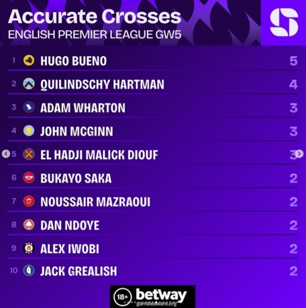 英超第5轮精准传中榜:乌戈-布埃诺5次居首,哈特曼4次第二9月24日讯 英超第5轮战罢,squawkafootball列各项数据排行,狼队后场球员乌戈-布埃诺是精准传中次数最多的球员,共5次。 英超第5轮精准传中榜: 1、乌戈-布埃诺(狼队):5次 2、哈特曼(伯恩利):4次 3、亚当-沃顿(水晶宫):3次 麦金(阿斯顿维拉):3次 马利克-迪乌夫(西汉姆):3次 6、萨卡(阿森纳):