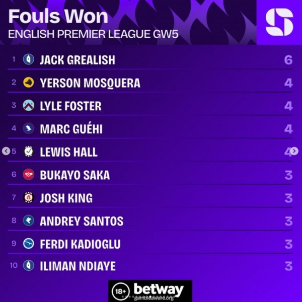 英超第5轮造违例 榜:格拉利什6次居首,格伊等4人4次第二9月24日讯 英超第5轮战罢,squawkafootball列各项数据排行,格拉利什是本轮造对手违例 次数最多的球员,共有6次。 英超第5轮造违例 榜: 1、格拉利什(埃弗顿):6次 2、耶森-莫斯克拉(狼队):4次 莱尔-福斯特(伯恩利):4次 格伊(水晶宫):4次 刘易斯-霍尔(纽卡):4次 6、萨卡(阿森纳):3次 约书亚