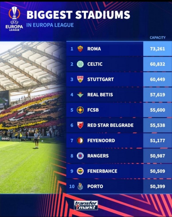 本赛季欧联杯球队主场作战 最大容量榜单:罗马居首,凯尔特人次席9月24日讯 德转盘点了本赛季欧联杯参赛球队主场作战 最大可上座人数榜单,其中罗马主场作战 居首,具体榜单如下: 1、罗马 73261人 2、凯尔特人 60832人 3、斯图加特 60449人 4、贝蒂斯 57619人 5、布拉勒斯特星 55600人 6、贝尔格莱德红星 55538人 7、费耶诺德 51177人 8、流浪者 50