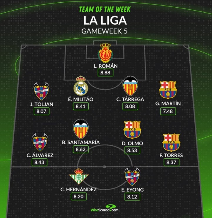 9月22日讯 西甲第五轮战罢,数据网站Whoscored也评选出本轮西甲最佳阵,足球现场直播视频在线观看费兰等巴萨3人在列,米利唐如选。以下为具体阵形 :