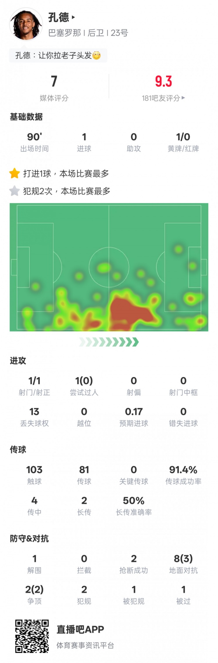 9月29日讯 2025-26赛季西甲职业联赛 第7轮,巴萨2-1皇家社会,孔德杆位出战,打进1粒得分 ,足球直播高清在线直播还有1次解围和2次抄截 ,2次争顶均成功,评分7.0。