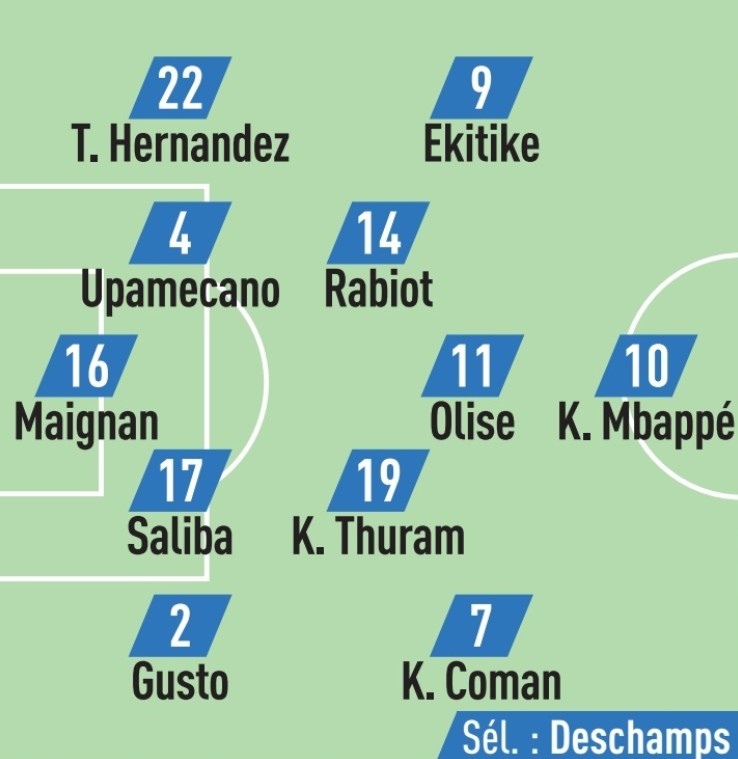 队报预测法国队杆位:迈尼昂;特奥、于帕梅卡诺、萨利巴、古斯托;拉比奥特、K-图拉姆、埃基蒂克、奥利塞、科曼;姆巴佩