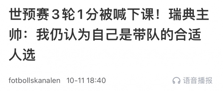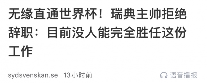 而在输给科索沃赛后,雨燕直播体育免费直播托马森接受采访时拒绝辞职,并称目前没人能完全胜任瑞典主帅这份工作。而一天内,瑞典足协便宣布解雇托马森。