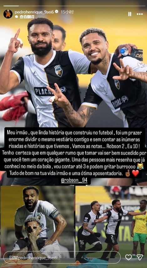 10月21日讯 在大连英博为罗伯森举办退役仪式后,曾与罗伯森共同在法伦斯竞赛 的云南玉昆外援佩德罗-恩里克,通过社媒向罗伯森送上了祝福。