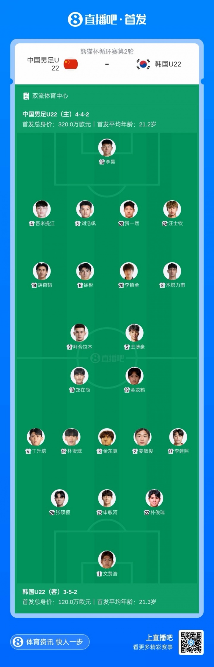 11月15日讯 北京时间今晚19点35分,熊猫杯第二轮,U22国足vsU22韩国,赛前杆位阵形 公布。【此役U22国足相比上场仅守门员位置做出调整,李昊出任杆位,蒯纪闻、刘诚宇、依木兰等参加全运会球员回归坐在后备 席,足球直播高清在线直播汪士钦、刘浩帆继续先发】