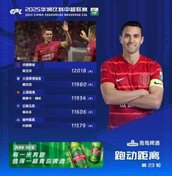 中超“跑男”!中超第23轮跑动榜:周定洋超1.2万米再度登顶10月5日讯 随着昨晚大连英博不敌青岛西海岸,中超第23轮赛事全部结束,中超官方今日发布第23轮跑动榜,蓉城中场球员周定洋再度登顶。 附中超第23轮移动距离 榜: 1、周定洋(成都蓉城)12018米 2、佩尼亚(大连英博)11980米 3、梅伦多(上海海港)11934米 4、侯永永(云南玉昆)11606米 5、约契奇(梅州客家)
