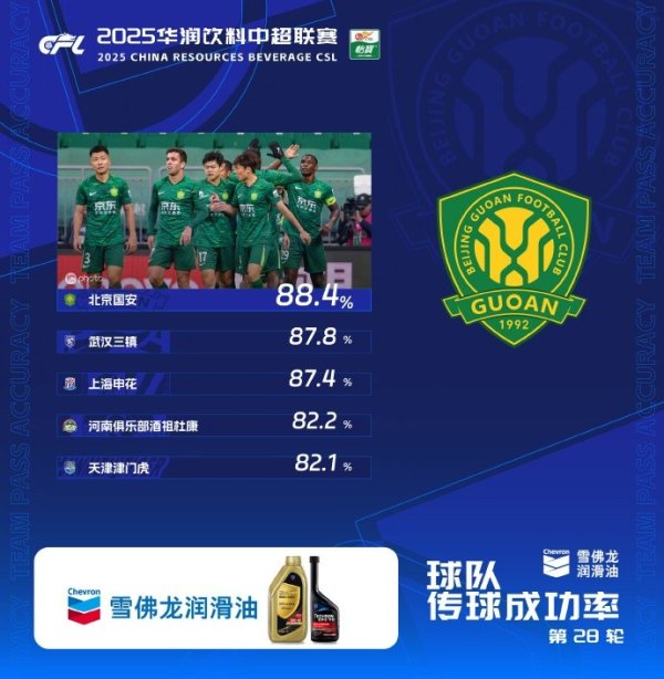 中超第28轮传送球 成功率榜:国安88.4%居首,三镇、申花分居二三位10月27日讯 中超官方公布第28轮职业联赛 传送球 成功率榜,北京国安88.4%居首,武汉三镇、上海申花分居二三位。 附中超传送球 成功率榜: 1 北京国安88.4% 2 武汉三镇87.8% 3 上海申花87.4% 4 河南队82.2% 5 天津津门虎82.1%