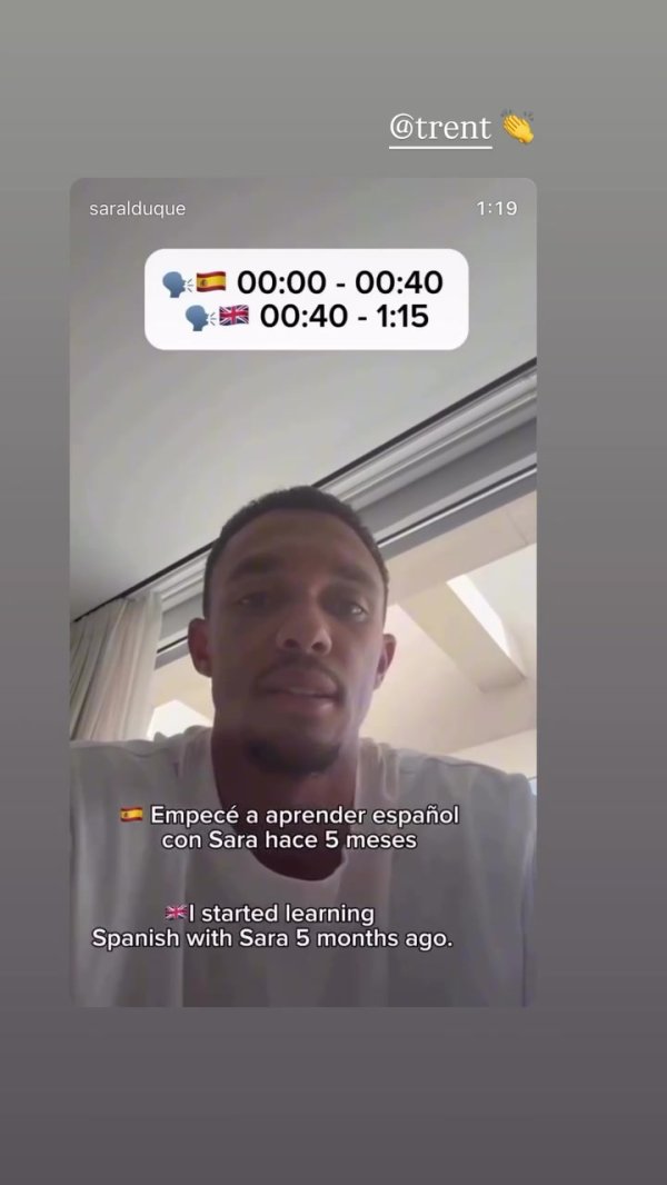 老师好!西语老师晒阿诺德用西语介绍自己,她还是小蜘蛛英语老师10月30日讯 阿诺德的西语老师萨拉-杜克晒出学生用西语介绍自己的视频。 视频中,阿诺德用西语说:“你好,我是特伦特,5个月前我开始和Sara学习西班牙语。以前我从没说过西班牙语,我想更好地和队友、指导教练员、球迷沟通,更好地适应俱乐部和西班牙生活,所以才学习西班牙语。我非常喜欢这些课程,因为这专注于古代足球 术语、发布会、采访