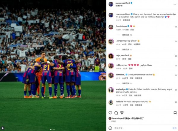 拉什福德社媒晒合照鼓励球队:职业联赛 是一场长跑,我们要继续奋斗10月27日讯 在本轮西甲国家德比,巴萨1-2不敌皇马。 本场赛事 拉什福德杆位出场送出助功 ,赛后他也在社媒晒出全队合照,配文写道:“显然昨天的赛事 结果不是我们想要的,但职业联赛 是一场长跑而不是冲刺 ,我们会继续奋斗 !”