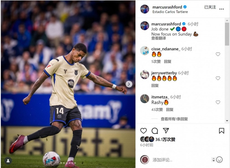 拉什福德社媒晒出赛事 照片,配文:“任务完成,雨燕体育直播免费高清现在专注于周日的赛事 (对阵皇家社会)。”