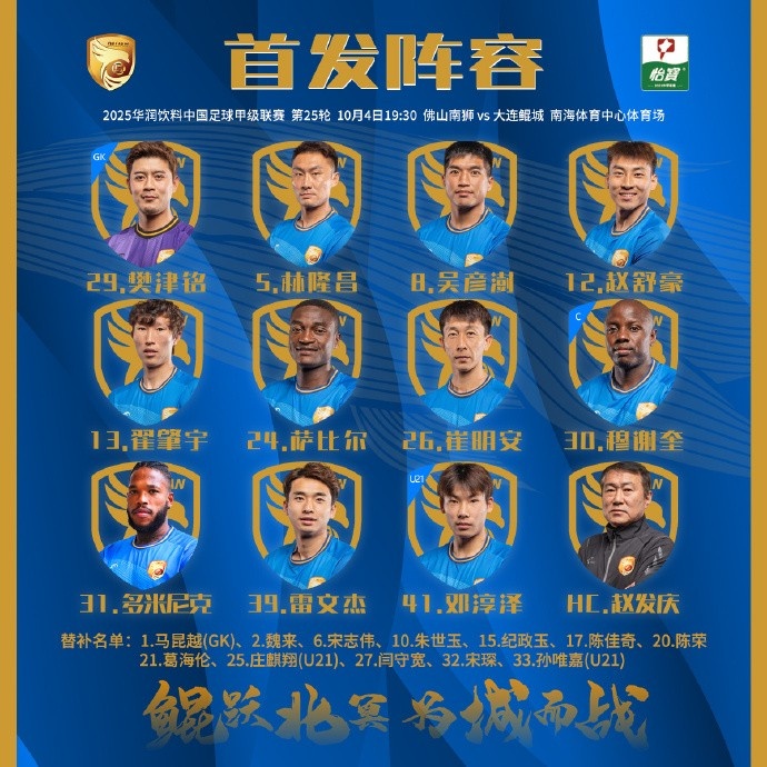 2025中甲职业联赛 第25轮,大连鲲城客战佛山南狮杆位出炉!