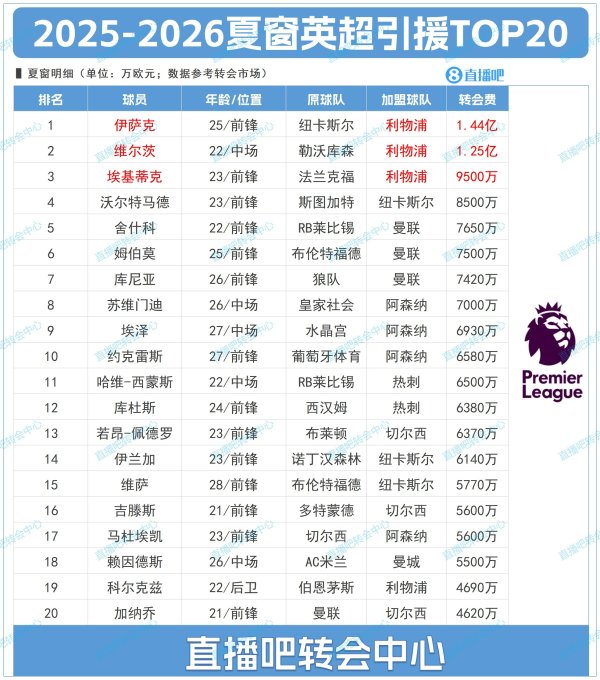 英超夏窗TOP20:利物浦霸榜前三&标王伊萨克 BIG6+纽卡包揽前20夏窗战火暂熄,硝烟散尽,各队新阵浮出水面。这是一个野心与钞票齐飞的赛季,有人一掷千金落下震撼足坛的重磅炸弹,也有人慧眼识珠觅得被低估的明日之星。现在,是时候为这个疯狂而又出色 的“军备竞赛”做一次全面的盘点了。 【转会中心】为吧友们总结了英超夏窗TOP20转会 1:伊萨克 25岁/前场球员 纽卡斯尔→利物浦 1.44亿 2:维尔
