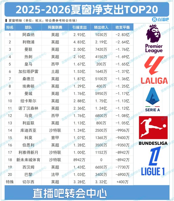 塔帅该夺魁 了!夏窗TOP20净支出:枪手2.83亿第1,切尔西倒反天罡夏窗战火暂熄,硝烟散尽,各队新阵浮出水面。这是一个野心与钞票齐飞的赛季,有人一掷千金落下震撼足坛的重磅炸弹,也有人慧眼识珠觅得被低估的明日之星。现在,是时候为这个疯狂而又出色 的“军备竞赛”做一次全面的盘点了。 【转会中心】为吧友们总结了夏窗TOP20净支出【收支均衡 】排行榜 1:阿森纳 -2.83亿欧 2:利物浦 -2.64