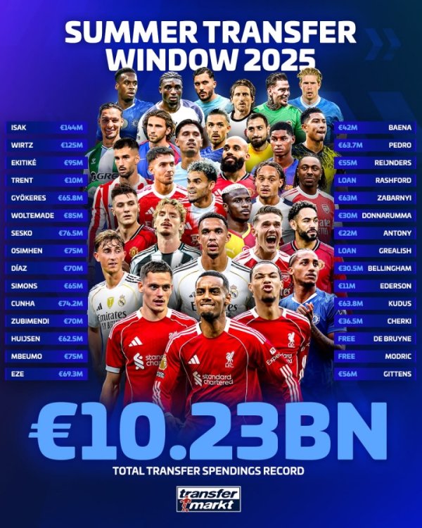 创造历史😱足坛夏季转会窗总支出102.3亿欧 刷新单窗口最高记录09月03日讯 德转发布海报,该机构统计表示,足坛今夏转会窗的总支出达到惊人的102.3亿欧。 这个金额是足坛单个转会窗历史最高,一个世纪级窗口! 【转会中心】夏窗各大职业联赛 投入top10 1:英超 投入35.60亿 2:意甲 投入11.90亿 3:德甲 投入8.51亿 4:西甲 投入6.81亿 5:法甲 投入6.36亿 6