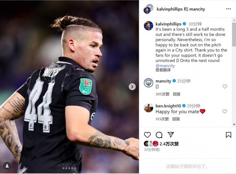 “但很高兴能够身披曼城运动活动 服 重返赛场,感谢球迷们的支持,这份心意我铭记于心,晋级下一轮 下一轮!”