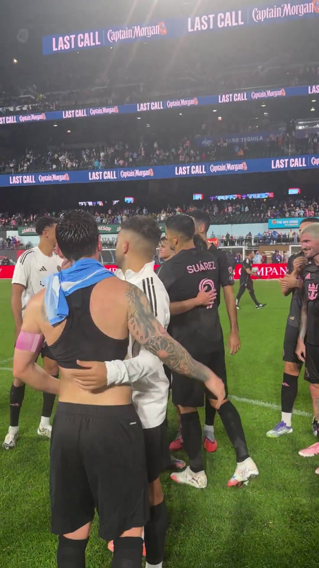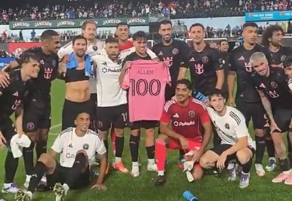 9月25日讯 美职联迈阿密国际4-0大胜纽约城,21岁迈阿密后场球员阿伦完成球队百场里程碑,赛后他领取百场纪念运动活动 服 ,全队合影庆祝。