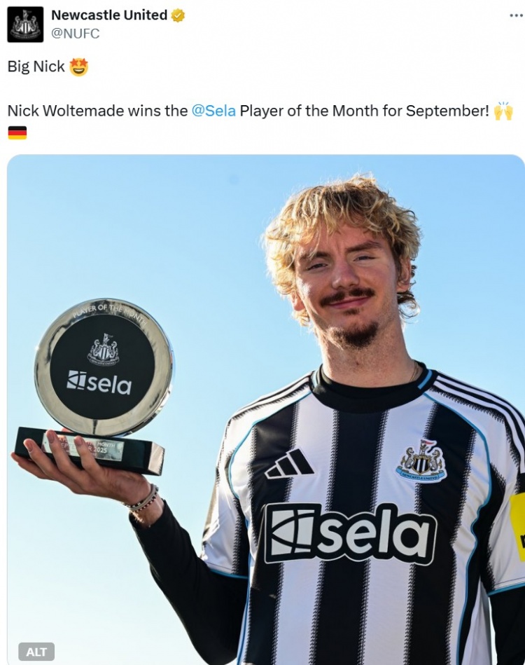 9月30日讯 纽卡官方公布了球队9月份队内最佳球员,新援沃尔特马德当选。