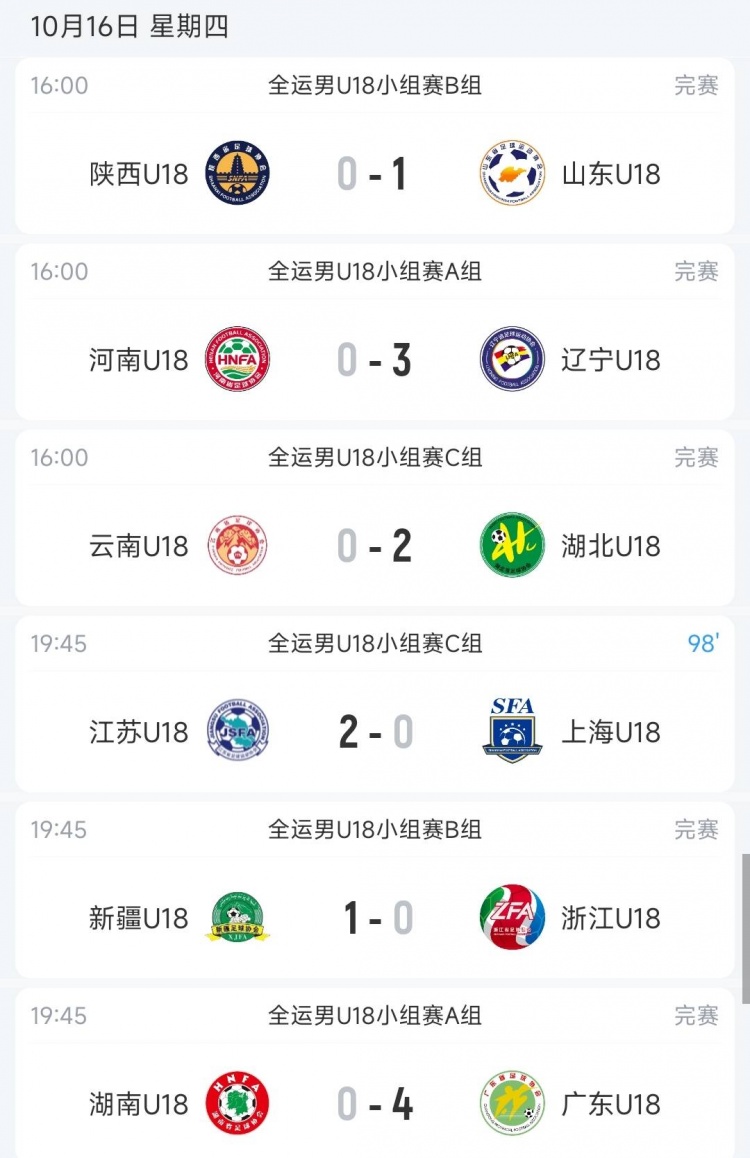 10月16日讯 全运会男足U18组今日进行了6场赛事 ,山东、辽宁、广东均取得获胜 ,178直播高清免费足球直播上海则不敌江苏。