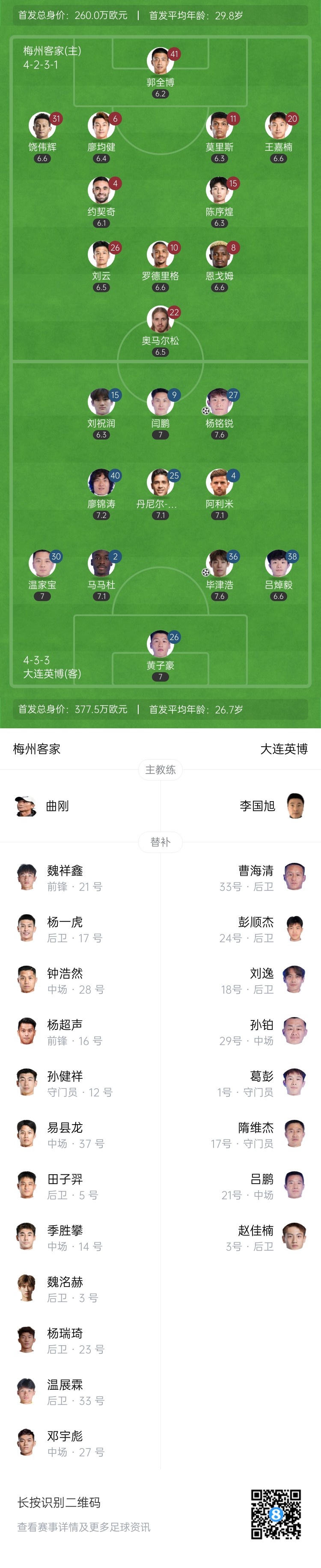 11月1日讯 北京时间19:35,中超第29轮梅州客家vs大连英博,赛事 在梅州五华奥体中心打响!上半场,闫鹏中柱;杨铭锐反击中帮助大连英博取得领跑 !毕津浩顶球补射再下一城。半场结束,梅州客家主场作战 暂时0-2追赶 大连英博!