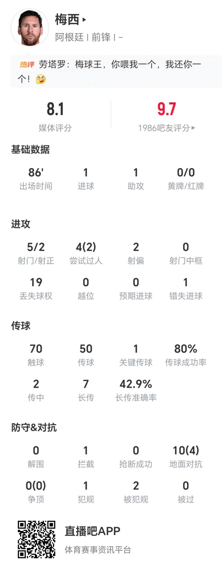数据统计数据显示,梅西本场赛事 5射两正,足球直播高清在线直播打进1球并送出1次助功 ,4次过人两次成功,1次关键传送球 ,10次地面对峙 成功4次,获评8.1分。