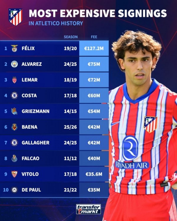 马竞队史最贵引援榜:菲利克斯1.272亿欧居首,小蜘蛛7500万次席11月12日讯 阿波罗体育资本斥资13亿欧元收购马竞俱乐部55%股份,并承诺未来几年再投资约13亿欧元,德国转会市场统计了马竞队史引援的费用,并列出最贵引援排名。 马竞队史最贵引援排名: 菲利克斯——1.272亿欧 阿尔瓦雷斯——7500万欧 勒马尔——7200万欧 迭戈·科斯塔——6000万欧 格列兹曼——5400万欧 巴埃纳