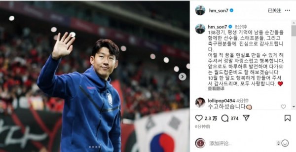 孙兴慜社媒:很自豪为韩国出战138场,我会继续努力准备比赛 世界杯赛10月15日讯 韩国对阵巴拉圭的友情 赛,孙兴慜杆位出战,帮助韩国2-0取胜,此役也是他为韩国出战的第138场赛事 ,继续刷新韩国队球员出场记录 。 孙兴慜在社交媒体上写道:“138场赛事 ,衷心感谢与我共同创造难忘时刻的球员、工作人员,以及球迷们,感谢你们让我实现儿时的理想 ,我感到非常自豪和幸福。 ” “今后我会继续每天努力