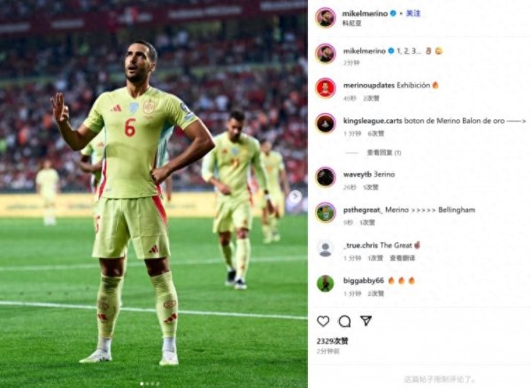 职业生涯首帽! 梅里诺社媒晒翻白眼扮酷庆祝: 1、2、3…直播吧9月8日讯 西班牙在本轮世预赛6-0血洗土耳其,梅里诺上演职业生涯首个独中三元。 第22分钟,西班牙危险区域 内连续的一脚传递,最终奥亚萨瓦尔助功 梅里诺破门。 第45+1分钟,又是西班牙精妙的攻击 协作 ,奥亚萨瓦尔危险区域 左侧下底回做,梅里诺跟进无人盯防轻松低射破门。 第57分钟,西班牙再次反击,亚马尔做球助功 ,梅